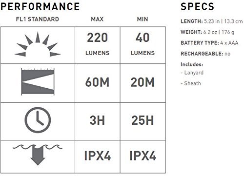 SPECS: 40-220 lumens, 20-60 meter range, and up to 20 hours of run time. Weighs 176 g and measures 5.23 inches long. Water resistance level IPX7.