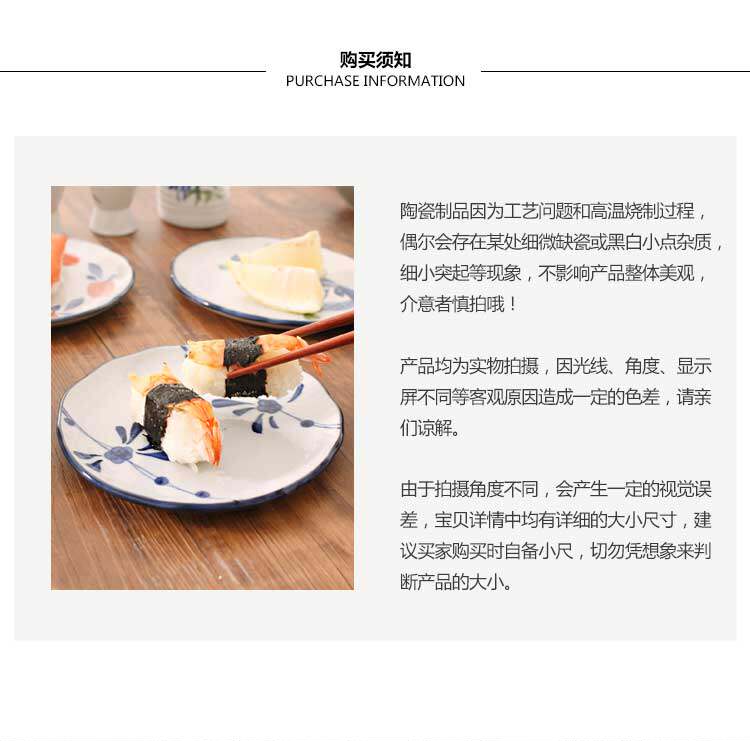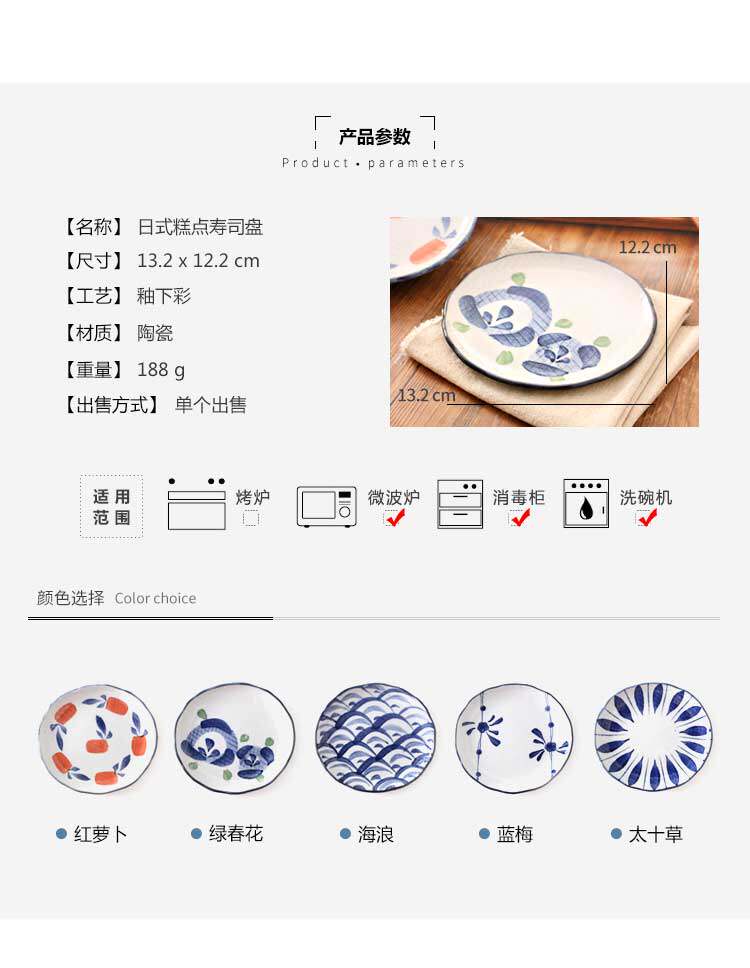 经过高温1330℃烧制而成,可把陶土里的有害金属(铅)完全烧尽,无毒、无味、无铅,并色泽鲜艳。且材质光泽坚固耐用、耐高温、耐寒、耐腐蚀、不褪色,不仅具有自然美,更具有浓厚的文化气息和时代感 尺寸: 6英寸 个数: 1个 材质: 瓷茶餐具 工艺: 釉下 彩图案: 其他 风格: 日韩盘 类型: 平盘 After high temperature 1330 ℃ baked the clay can be harmful in metal (lead) is completely burned, non-toxic, tasteless, lead-free, and bright color. Material and shiny, durable, high temperature, cold, corrosion-resistant, do not fade, not only has the natural beauty, but also has a strong culture and contemporary Size: 6 inches Number: 1 Material: porcelain tea utensils Technology: underglaze Wallpapers case: Other Style: Japan and South Korea dish Type: flat plate