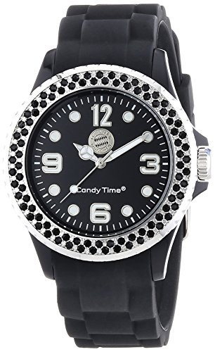 Was für ein glanzvoller Auftritt! Für den Rekordmeister Bayern München gehört beste Performance zum Tagesgeschäft. Sportlich-elegant ist die lizensierte Candy Time® for FC Bayern München Juicy Glamour der Marke MADISON NEW YORK mit hochwertigen schwarzen SWAROVSKI® ELEMENTS auf der Lünette bestückt und besticht durch ein edles Design, das durch ein elegantes schwarzes Armband fulminant ergänzt wird. Das robuste Gehäuse ist durch ein leichtes, antiallergisches Silikon-Armband verbunden, das dank einer stabilen Edelstahlschließe besten Tragekomfort bietet und speziell für Damen-Handgelenke entworfen wurde. Durch die Leichtbauweise und einer Wasserdichtigkeit bis 5 Bar eignet sich die Candy Time® for FC Bayern München Juicy Glamour auch für sportliche Aktivitäten und ist gegen Spritzwasser gewappnet. Unter dem Mineralglas und dem im Metallic-Look gehaltenen Zifferblatt mit FC Bayern München Logo arbeitet ein japanisches Hochpräzisions-Qualitätswerk. Die fluoreszierenden Zeiger und Details sorgen auch bei einsetzender Dämmerung und Dunkelheit noch für Aufsehen und erlauben eine schnelle Zeiterfassung. Die Candy Time® Juicy Glamour zeichnet sich durch hochwertige Komponenten aus und verleiht jedem Dress eine elegante Note.Anmerkung zum Artikel: Neu