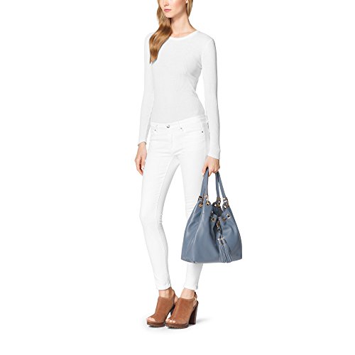 Crafted from luxe leather, the slouchy Camden tote is understated enough to complement every ensemble. Its soft pebbled leather beautifully highlights its silhouette, while chic tassels punctuate the look. Soft Venus Leather. Gold-Tone Hardware. Strap: 10". Interior: One Zip Pocket, Three Open Pocket, One Cell Phone, One Key Fob. Magnetic Closure. Interior Lining: 100% Polyester. 14.5" X 8.5" X 5.5". Color: PALE BLUE