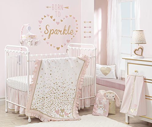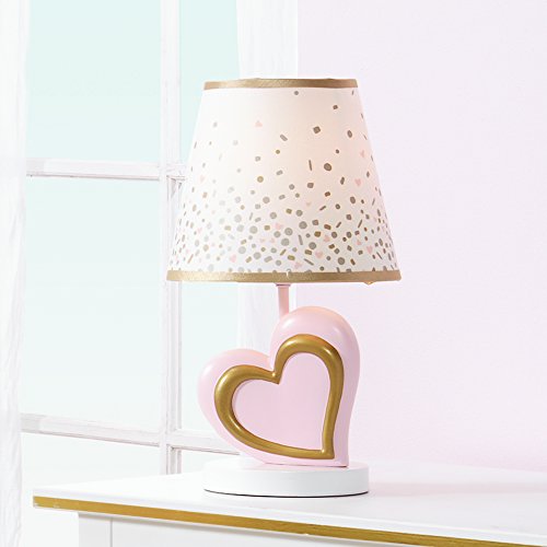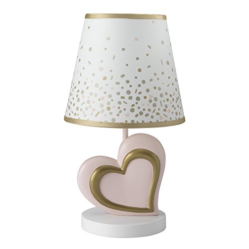 The Confetti Lamp features a large pink tilted heart with a sculpted smaller gold metallic heart on a crisp round white base. The coordinating lamp shade is decorated with confetti and trimmed in gold metallic.
