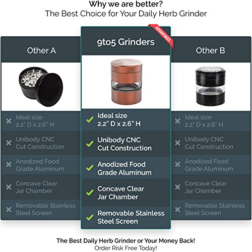 ✅ > THE ORIGINAL < UNIBODY JAR GRINDER DESIGN - Don't settle for lesser quality and look-alikes that make similar claims to the construction of their grinders. Seeing is believing with 9TO5 GRINDERS. The success is in the details, which is why each 9to5 grinder is inspected by hand a second time in the USA to ensure you receive our highest quality guaranteed!