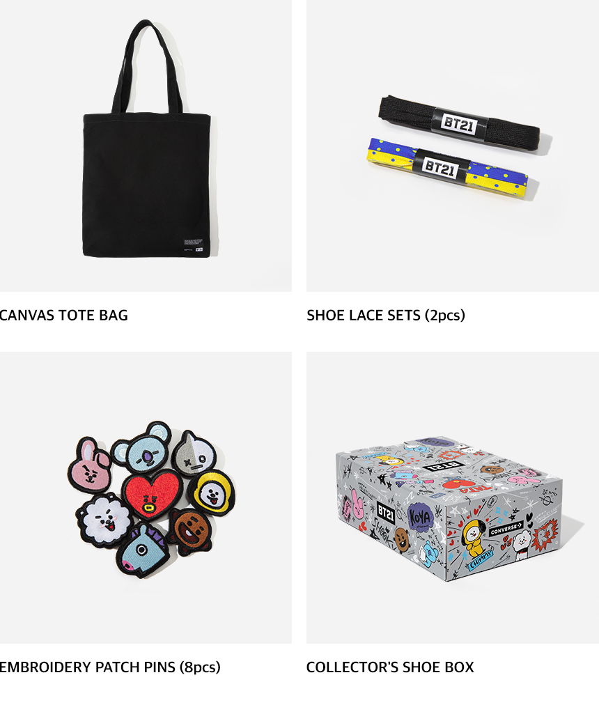 It is 100% authentic official BT21 x Converse ShoesItem Detail- Package : Original Box x 1 , Shoes x 1, Patch Pin x 8pcs , Shoe Lace x 2pcs , Tote Bag x 1