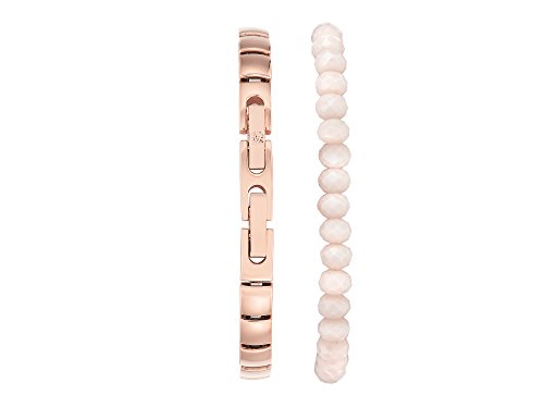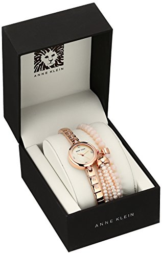 Watch Sizing Guide Find a luxuriously feminine flair with this darling Anne Klein® watch set! Boxed set includes watch and beaded bracelet with jeweled tassel. Stainless steel case. Slim, rose gold-tone bracelet with crystal detailing and jewelry clasp closure. Round face. Three-hand analog display with quartz movement. Mother of Pearl dial features rose gold-tone hands, crystal hour markers, and Anne Klein detailing. Water resistant. Display case included. Imported. Measurements: Case Height: 22 mm Case Width: 22 mm Case Depth: 8 mm Band Width: 6 in Band Circumference/Length: 7 1⁄2 in Weight: 1.2 oz This product may have a manufacturer's warranty. Please visit the manufacturer's website or contact us at warranty@support.zappos.com for full manufacturer warranty details.Feature