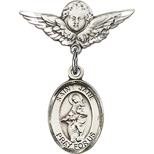 -. Title : Sterling Silver Baby Badge with St. Jane of Valois Charm and Angel w/Wings Badge Pin 7/8 X 3/4 inches