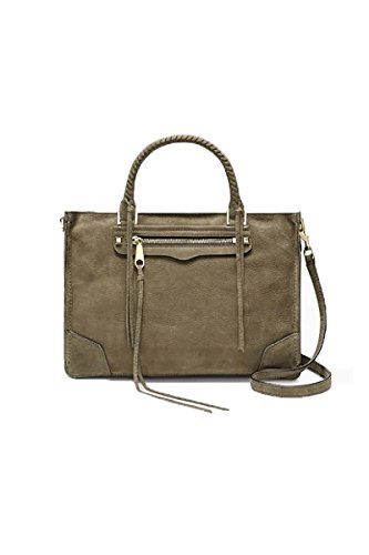 A large Rebecca Minkoff satchel in soft nubuck. A long pull hangs from the zip front pocket. Top zip and lined, 4-pocket interior. Rolled handles and optional, adjustable shoulder strap.