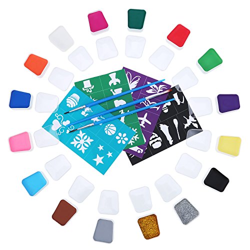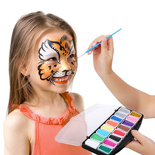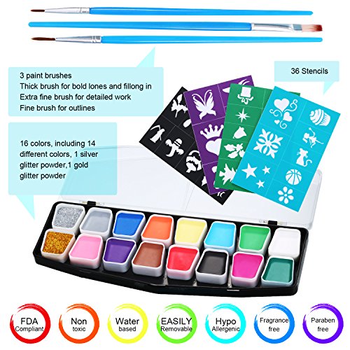 Mtlee 16 Color Halloween Face Painting and Body Paint Kit with 36 Stencils, 3 Pieces Face Painting Brushes, Safe Cosmetic Grade FDA Compliant Face Paints Party Set