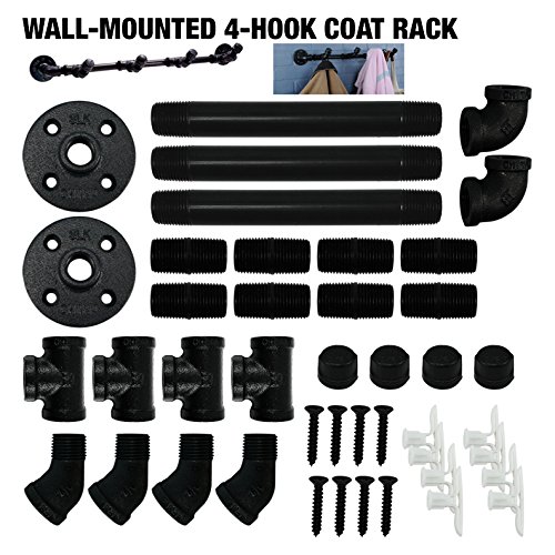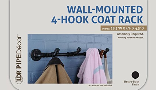 -. Feature : BUILD FUNCTIONAL CONTEMPORARY FLAIR into any home, garage, workshop or office. This four hook coat rack adds modern DIY appeal anywhere with a blend of convenience and fashion. Perfect for hanging coats, jackets, hoodies, hats and other outerwear. Solid and secure for backpacks, purses and bags. / ENTIRE KIT SEALED WITH ELECTROPLATING AND READY TO ASSEMBLE OUT OF THE BOX. Easy to follow directions. Electroplated finish prevents rust without the hassle and mess of cleaning grease or oil. No need to paint either. Open the box and install. Mounting hardware included. If you want the industrial look without the industrial cleanup, this is the product for you. / DELIGHT GUESTS WITH A RUSTIC NEW LOOK TO YOUR ENTRANCE using this complete industrial pipe coat rack set. Quickly change the design and feel of a hallway, foyer, bathroom, bedroom, closet, lobby or waiting room. Instant do-it-yourself quality. Constructed from extremely sturdy and durable material. Strong enough for your heaviest seasonal clothing. / MADE WITH HIGH QUALITY AND DURABLE INDUSTRIAL PIPE FITTINGS. You will know Pipe Décor parts and accessories when you hold them. Beauty and beast. Strength and style. This is real industrial pipe finished for your decoration and designs. Accept no substitutes. Extra pieces and accessories are available for your custom fixture projects and expansions. Plug and play as desired. / DIY STYLE WITHOUT DIY DIFFICULTY. Included parts: (2) ½ inch floor flange; (8) ½ inch X 1¼ inch connector; (2) ½ inch 90 degree elbow; (2) ½ inch tee; (3) ½ inch X 5 inch connectors; (4) ½ inch 45 degree street elbow; (4) ½ inch cap; installation fasteners included; simple step by step illustrated instructions. Tested for durability. Rack is approximately 28.5 inches long X 4 inches high X 4.5 inches deep. Limited warranty. Manufacturer part number 364 12COAT4-BK.
