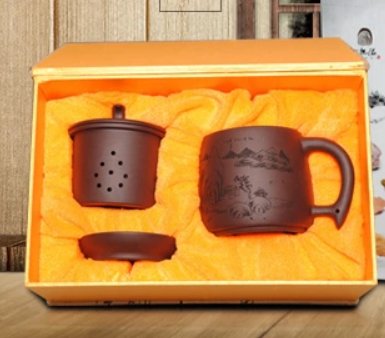 -. Feature : Material: Yixing Purple Clay ("Zi Sha" Clay) / Capacity: 14 oz. Dimensions: 3.2" Diameter, width 5" with handle, Height 5" / Quantity: 1 Tea cup / Great for steeping oolongs and pu'erhs. A gift box included. / Country of Origin: China. Ship from China