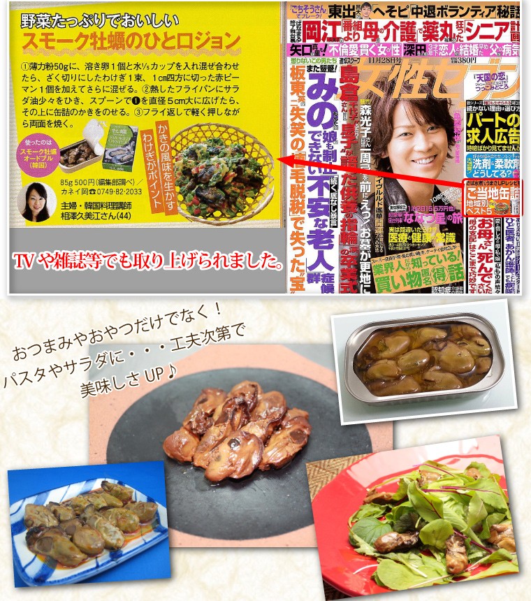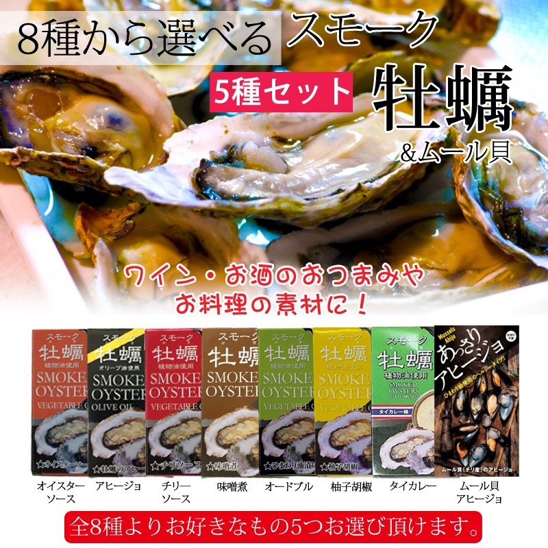 ~スモーク牡蠣(6種類)~スモークすることで旨味と甘みを引き出した牡蠣を、ビタミンEが豊富な、さっぱりとしたひまわり油やオリーブ油に漬け込みました♪生臭さはほとんどなく、スモーク特有の香ばしさと濃縮された牡蠣の旨みをお楽しみいただけます◎