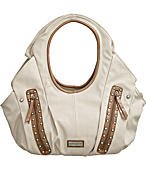 -. Feature : Top zipper closure - Measures approx. 9.5'' Height, 17'' Length, 5.5'' Width / Faux leather - Silver tone metal / 2 exterior pockets - Lining: cotton/nylon blend / 3 pockets inside - One of the pockets is sized to hold a cell phone / Strap: 9'' drop