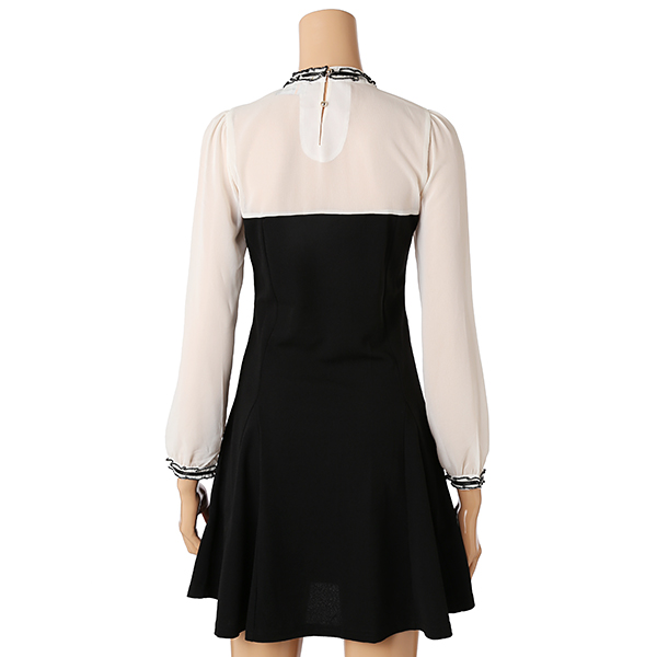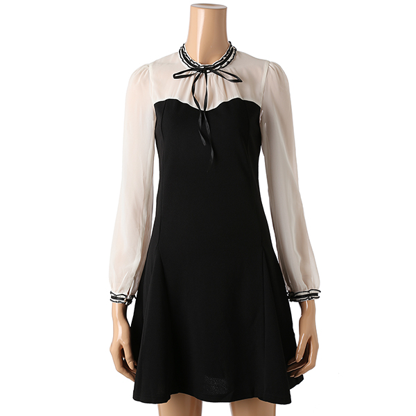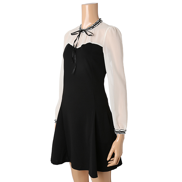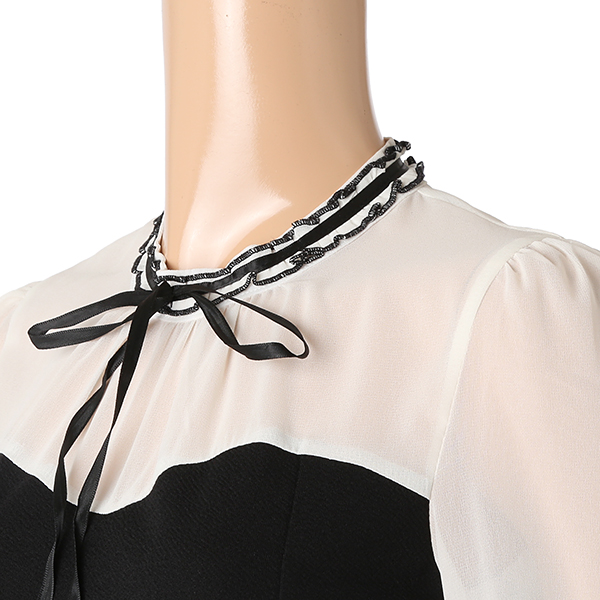 넥 프릴과 소매 프릴이 귀여운 리본 포인트의 A라인 원피스입니다.