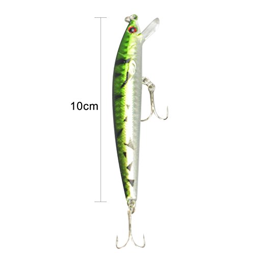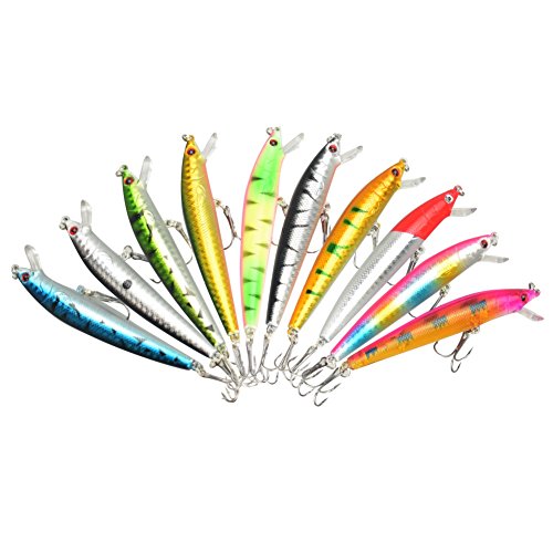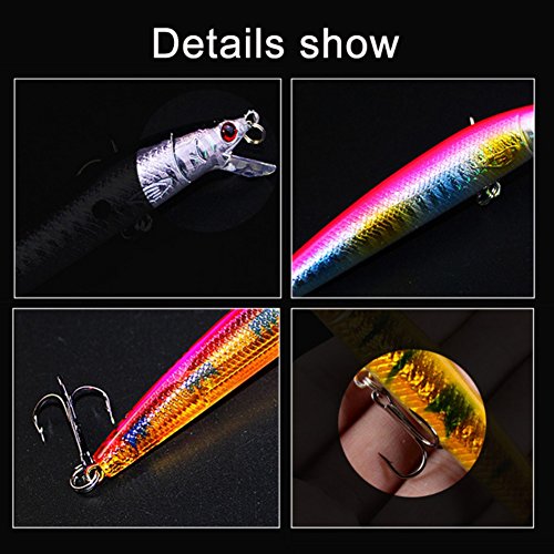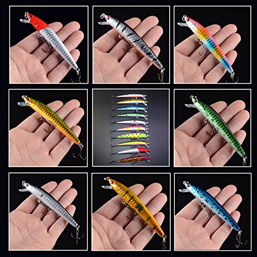 -. Feature : 10pcs floating hard lures in a package. Two types to select. / Colorful and vivid fish shaped baits for attracting big fishes, such as Bass, big squawfish, culter alburnus, etc. / Each artificial lure comes with two 6# sharp, sturdy and impact resistant treble hooks. / Bright scale laser light reflects the outside light in full angles. / Internal steel ball and 3D eyes make it a great and powerful catching fishing tool.