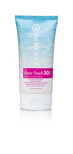 Surface SPF 30 Sheer Touch sunscreen lotion. Signature tropix fragrance. 80 minute water resistance. SPF50 UVA/UVB Broad Spectrum Protection. Paraben free. 6 oz. Made in USA.Feature