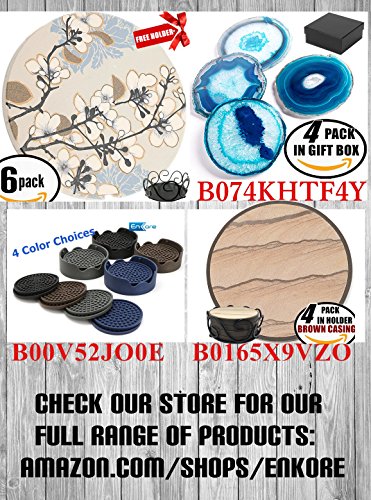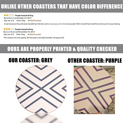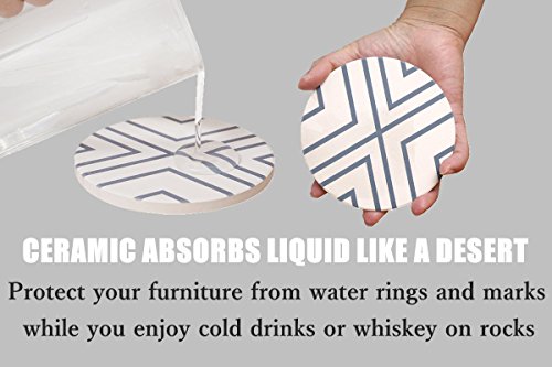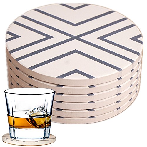 ENKORE Absorbent Coasters For Drinks - Grey-Lines On Ceramic Stone With Cork Backing - "drink" spills Coaster Set of 6 Protect Your Furniture From Damage By Cold Sweat And Wet Rings