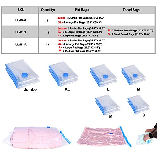 - Feature : DURABLE DESIGN - Made of high quality PA+PE, double zipper design to avoid air leaking, reusable and long lasting / SPACE SAVING - Save your valuable storage space up to 75%, just put your clothes or bed linen in the bags and remove the air with any household vacuum cleaner hose or pump / AIRTIGHT & WATERPROOF - Perfectly protects items from external factors as moisture, mildew, insects, odors, or any other damaging factors. Great for household storage and house moving / MULTIUSE - Multi used for storing a variety of clothing and bedding like Out of Season Clothing, Blankets, Comforters & Pillows / VARIETY OF CAPACITY - 13 Pack Vacuum seal bags in four sizes to accommodate your needs: 2 Jumbo, 4 X-Large, 4 Large and 3 Medium