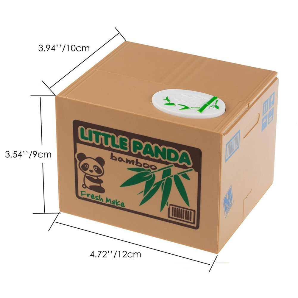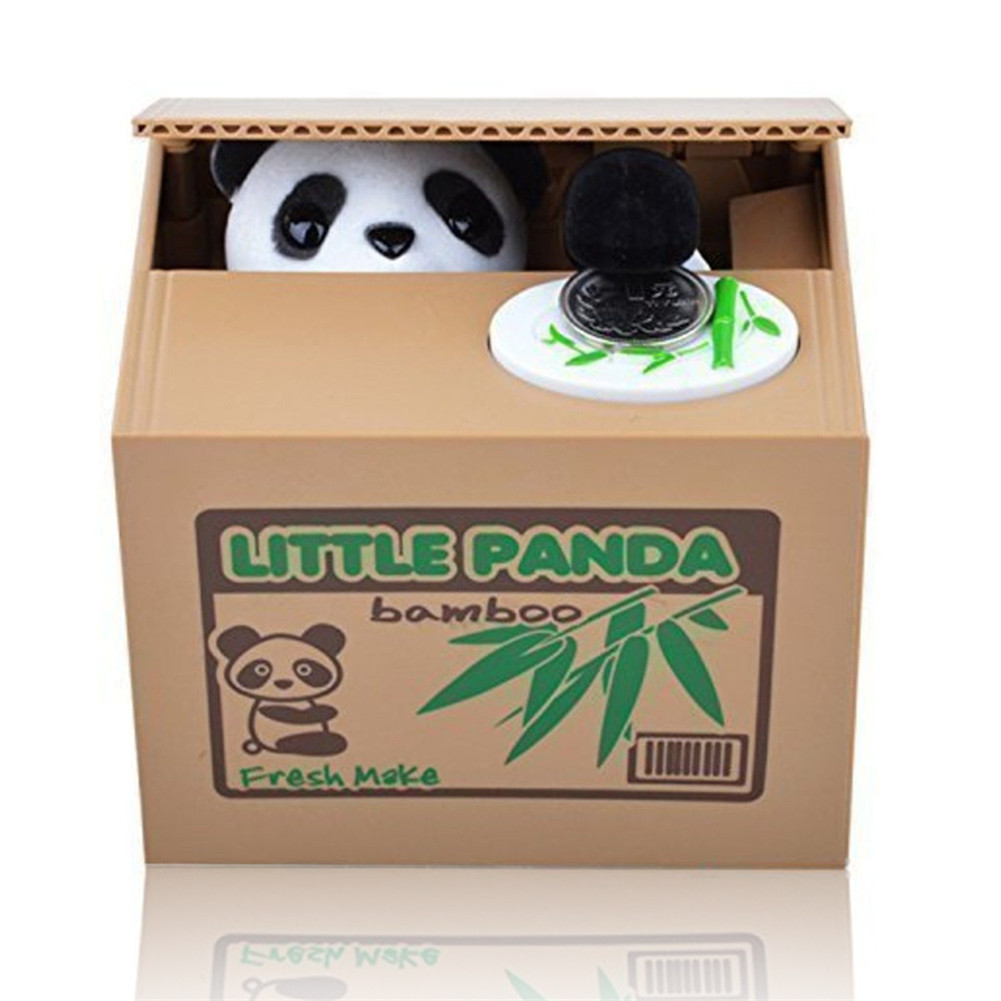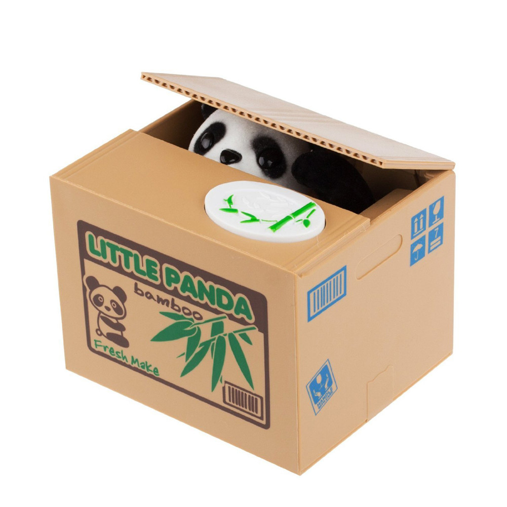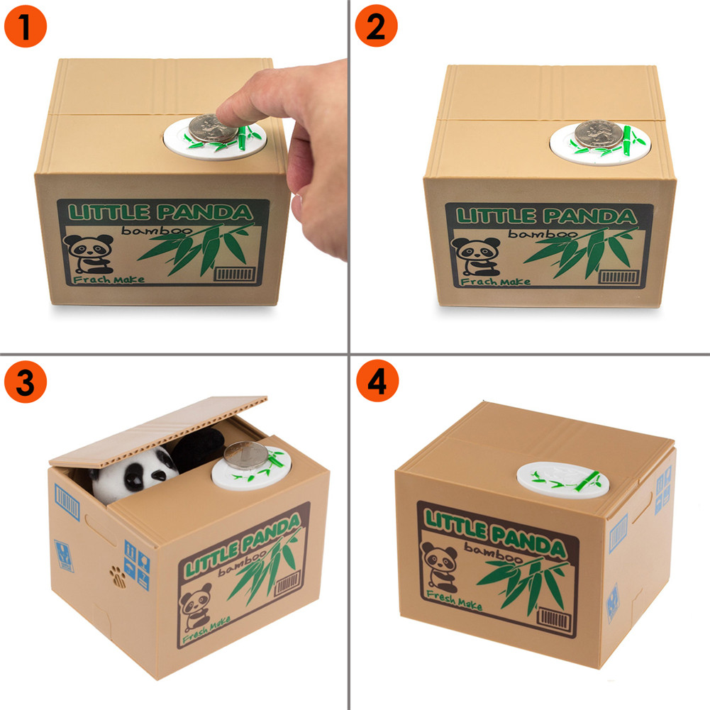 Adorable mechanical panda comes out of cardboard box to steal your coins to help you save money。
