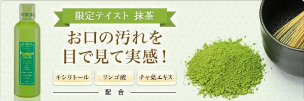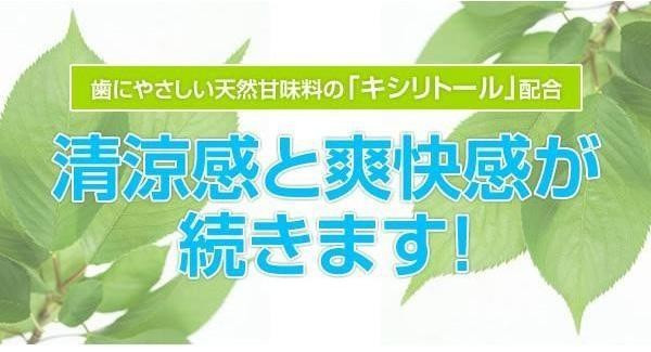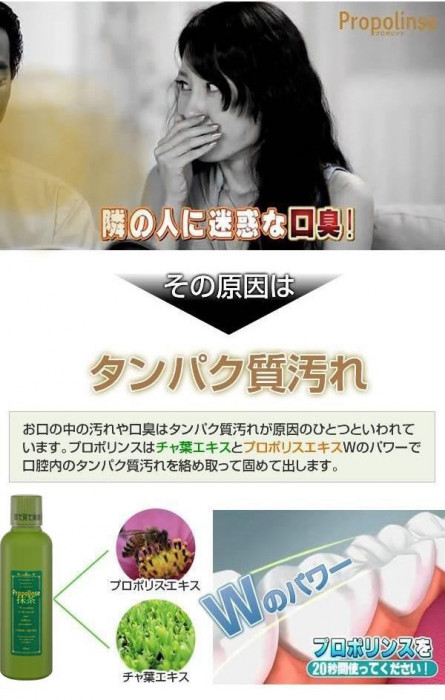| 成分 | 水、グリセリン(湿潤剤)、エタノール(溶剤)、PEG-60水添ヒマシ油(可溶化剤)、チャ葉エキス・プロポリスエキス・キシリトール・メントール・サッカリンNa(香味剤)、クエン酸・クエン酸Na・リンゴ酸(pH調整剤)、カラメル(着色剤)、メチルパラベン(保存剤)、香料 |
