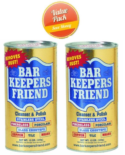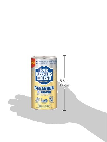 Bar Keepers Friend, 12 OZ Cleanser and Polish, Non Abrasive Powder, Removes Rust and Hard Water Stains, For Copper, Tile, Brass, Stainless Steel, Porcelain, Plastics and Glass Cooktops. DO NOT USE BAR KEEPERS FRIEND ON: Gold, silver, pewter, marble, lacquered metals, or anodized aluminum.Feature