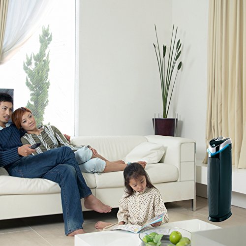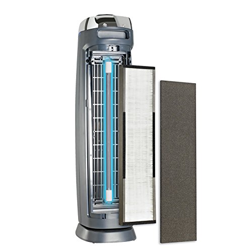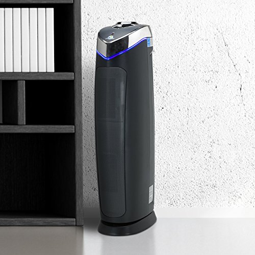 The GermGuardian AC5000E, 3-in-1 air cleaning system has multiple levels of cleaning to capture allergens, kill airborne viruses and bacteria, and destroy mold spores and odors. It is ideal to use in large size rooms and cleans 20 percent more compared to the GermGuardian model AC4825. It stands 28-inches tall, is CADR rated 125+. Here's how it works: First, a pre-filter and a charcoal filter combine to capture large particles like dust and lint, as well as reduce common household odors. Then, a True HEPA filter captures 99.97 percent of airborne particles, as small as 0.3 microns in size, such as dust mites, debris, mold spores, plant pollens, and pet dander. Finally, UV-C light technology works to help kill airborne viruses, bacteria, mold spores, and with titanium dioxide, decomposes odor molecules caused by smoking, cooking, and pets.