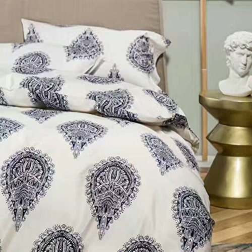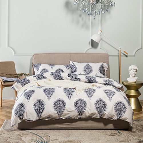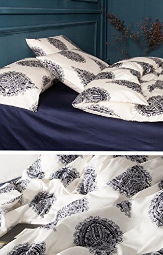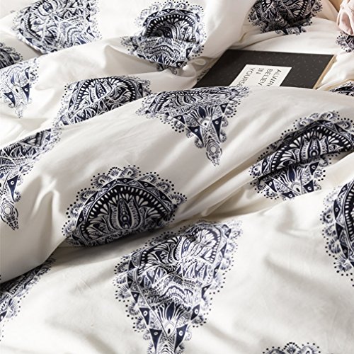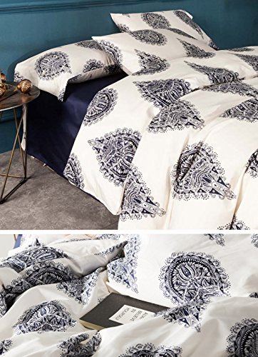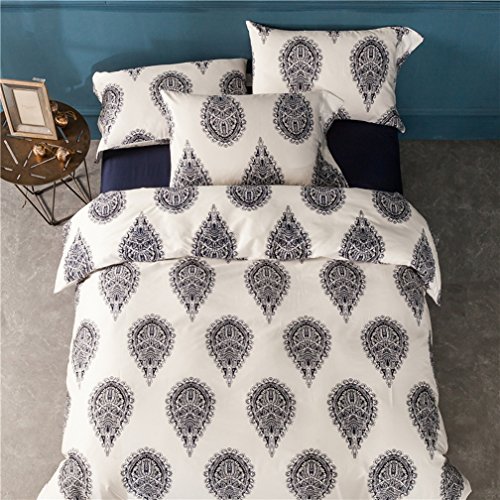 Damask Medallion Luxury Duvet Quilt Cover Boho Paisley Print Bedding Set 400 Thread Count Egyptian Cotton Sateen Vibrant Bohemian Pattern (Queen, Navy White)