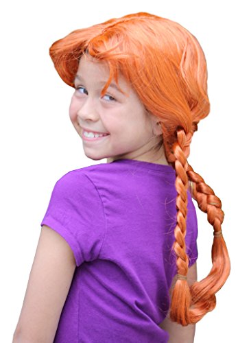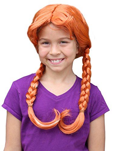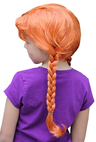 This auburn wig with braids comes with two pigtails and a silver streak in one of the braids. This child size wig makes the ideal Princess Anna Wig or Wendys Wig. One size fits most kids 12 and under.Feature