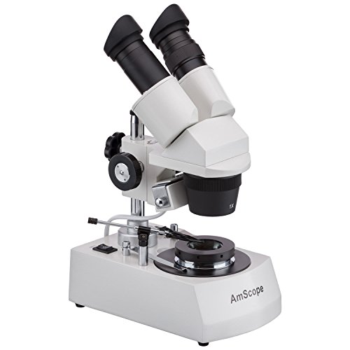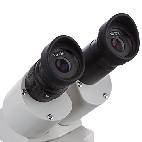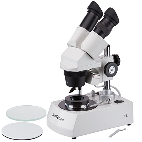 The AmScope SE305-P-DK stereo microscope has a pair of 10x18mm widefield eyepieces, 1x and 3x objectives, upper and lower halogen lighting, a darkfield condenser, two stage plates, and a pillar stand. The binocular viewing head has an interpupillary range of 55 to 75mm and a 45-degree inclination to ease viewing for young users. The WF10x18mm eyepieces combine with the 1x and 3x objectives to provide 10x and 30x magnification, and a longer working distance for inspecting large-scale specimens that require handling or repair. The optical glass lenses provide sharp images, and are fully coated to ensure high-resolution images. Dioptric adjustment accommodates individual eye-strength differences, and eye guards ensure comfortable viewing. A stereo microscope, sometimes called an inspection or dissection microscope, has low magnification and a long working distance that enables users to manipulate the object being inspected.