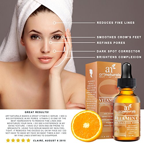 UNLOCK NATURE'S HIDDEN POTENTIAL WITH ART NATURALS VITAMIN C SERUM: ArtNaturals is proud to present our new All Natural Vitamin C Serum, the most effective, gentile, organically infused vitamin c serum available today. Blended and refined to reduce signs of aging, eliminate sun spots and damage, restore youthful glow, and minimizing existing wrinkles while preventing new wrinkle formation. ArtNatural stands apart from our competitors due to three unique combinations of scientific innovation, natural concentration, and organic infusion. First in this trio is the driving force in our vitamin c serum, Sodium Ascorbyl a new discovery in the vitamin c structure. Scientists and beauty experts have been able to unlock this new vitamin c derivative allowing us to offer you the numerous cosmetic benefits of vitamin c in a more effective and gentile form. Second is a uniquely concentrated base of pure vegan hyaluronic acid, a naturally occurring and powerful moisture-binding ingredient that keeps skin plump, hydrated and young-looking. Third is an infusion of enriched organic aloe and jojoba oils to provide additional healing and hydration for your skin and unleash powerful antioxidants all while preventing the formation of free radicals which contribute to signs of aging. The gentile stability and rapid absorption of our custom crafted formula allows it to be used along with makeup and daily moisturizers, while not irritating your skin or causing unsightly redness. Like all Artnaturals products you can buy at no risk to you with the confidence of our 100% customer satisfaction guarantee. 72% organic, vegan certified and cruelty free our Vitamin C Serum is made with the highest standards of ecological and environmental respect.