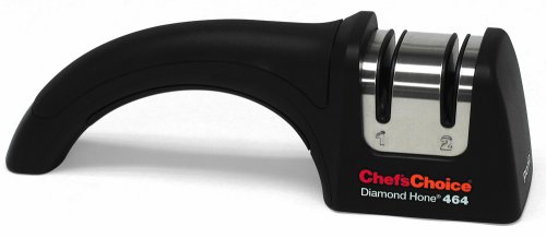 Studio : Edgecraft Publisher : Edgecraft Binding : Kitchen Product Description Chef's Choice Pronto Manual Diamond Hone Sharpener 464 is the fastest manual sharpener on the market. The 464 includes two stages, one for sharpening and a second for honing/polishing for a razor-sharp, arch- shaped edge that is strong and durable. 100% diamond abrasives are used in Stages 1 and 2, and the diamond abrasive wheel will hold shape indefinitely, and sharpen any alloy knife. Micron size diamond abrasives in stage 2 leave your knife with a super sharp polished edge. The precise bevel angle control sharpens to a 20 degree edge. The Pronto is safe to use on straight edge and serrated knives; kitchen and household knives, pocket knives and fish filet knives. 0