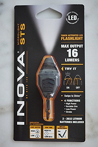 Studio : Nite Ize, Inc. Publisher : Nite Ize, Inc. Binding : Tools Home Improvement Product Description Featuring innovative "Swipe To Shine" touch technology, the INOVA Micro light STS is compact, convenient, and impressively powerful. Its durable, water-and-shock-resistant casing is designed to fit comfortably in your hand. It's our brightest INOVA Micro light, with an impressive 16 lumens. The white LED is activated nearly instantly with a quick right-to-left swipe of the thumb, eliminating the need to fumble with a switch. High, variable dimming, low, and flash modes allow you to use the light for everything from reading maps to finding keyholes to sending alert signals. The included versatile S-Biner Stainless Steel Double Gated Carabiner can be clipped to key chains, belt loops, zipper pulls, purse or backpack straps to keep your Micro light STS conveniently where you need it, when you need it. Powered by 2 replaceable 2032 lithium batteries (included). 0