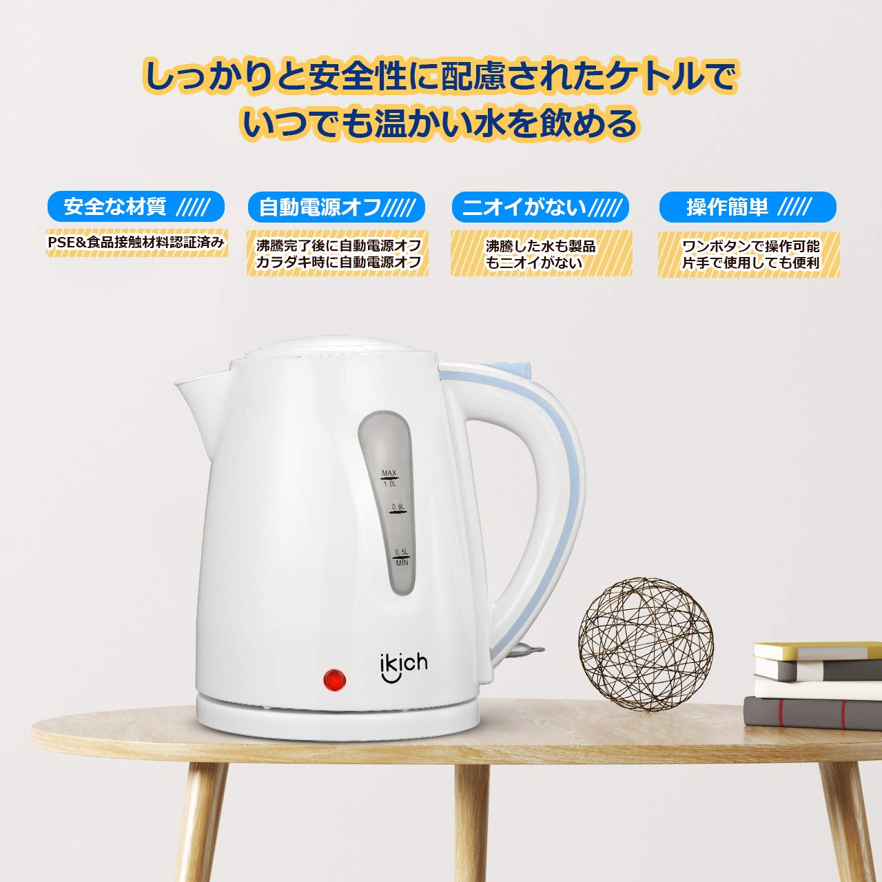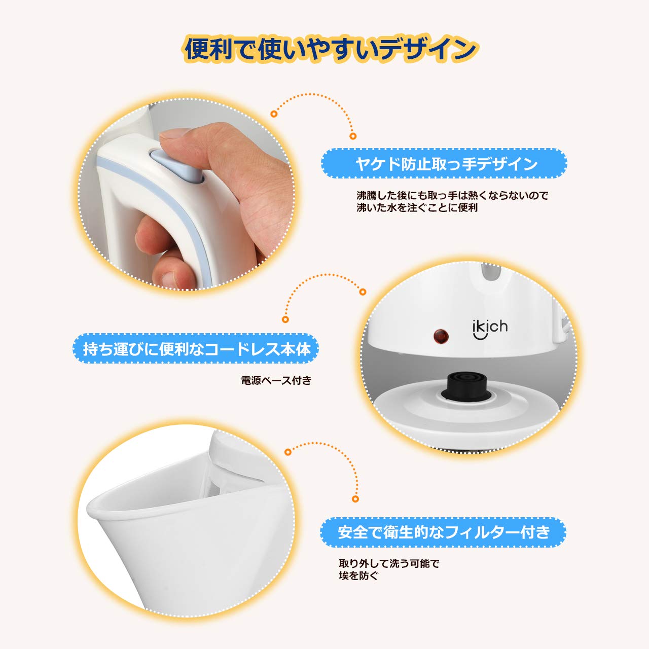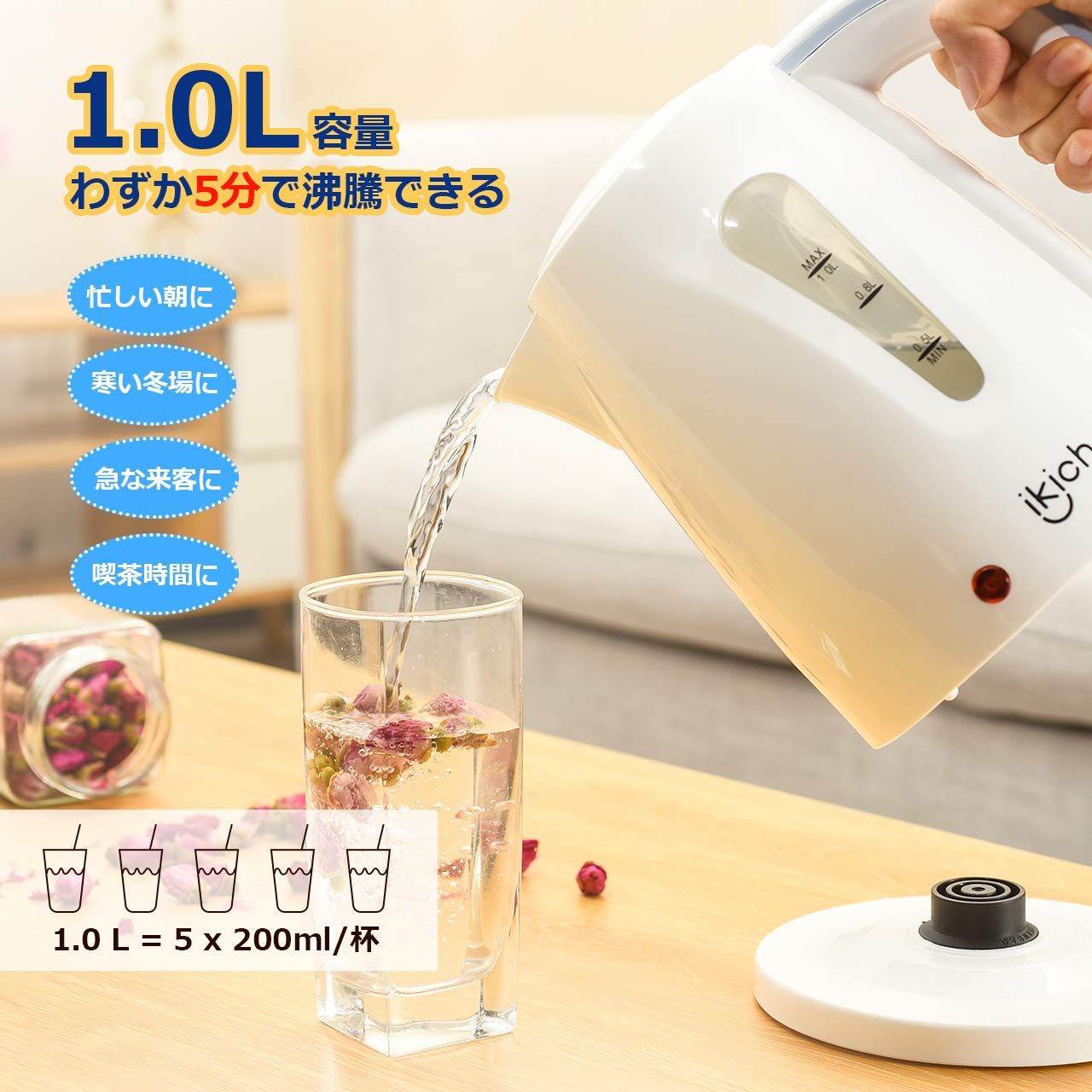 🎁【1.0L容量&コンパクトなデザイン】容量が1.0LのIKICH電気ケトルでで4〜5人分のお湯を楽しむことができます。コンパクトだから省スペースで食卓に置いても邪魔になりません。家庭でもオフィスでもお湯をいつでも用意できます。本体がコードレスだから持ち運びができ、女性やご年配の方でも、片手でラクに持ち運べて注げます。