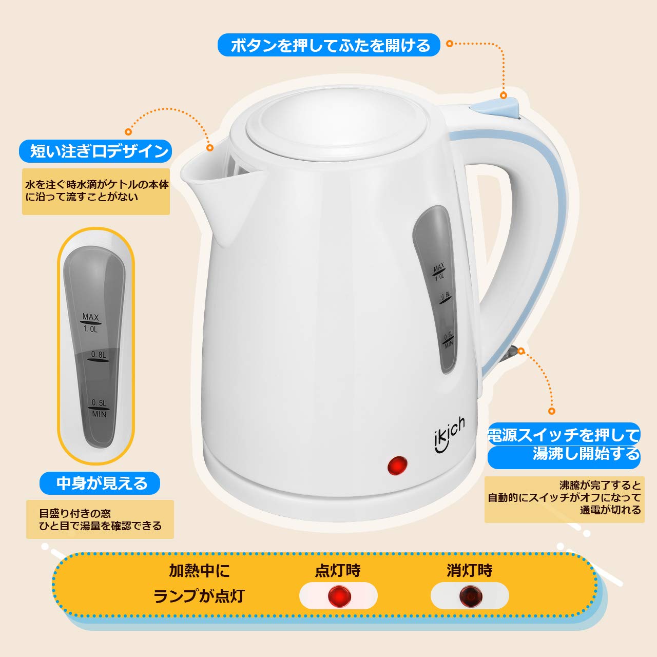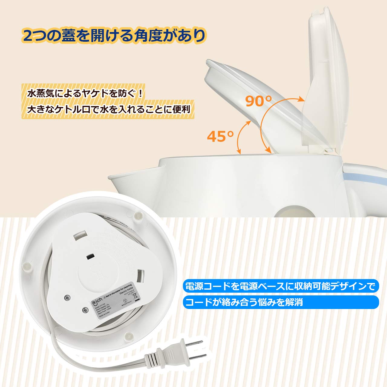 👪【人に優しいデザインで使いやすい】間口が2つの開ける角度があり、45°Cの角度で水蒸気によるヤケドを防ぎます。90°Cの角度が広くて、水入れやお手入れラクラクです。🔵電源コードを電源ベースに収納可能デザインで、コードが絡み合う悩みを解消します。🔵短い注ぎ口デザインは水を注ぐ時水滴がケトルの本体に沿って流さないようにします。🔵ケトル本体に窓が付いているので、水量と沸かし加減を一目で確認できます。🔵加熱中はランプが点灯してお知らせします。