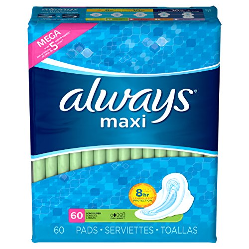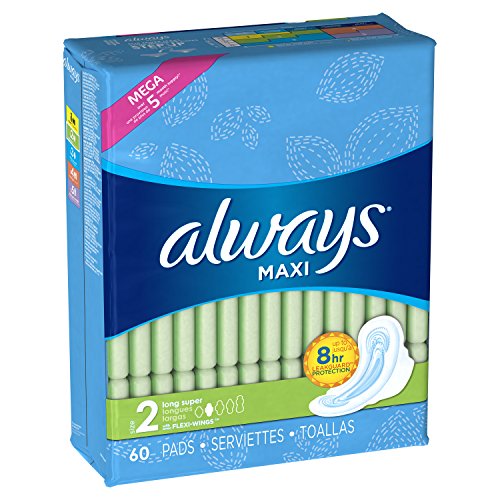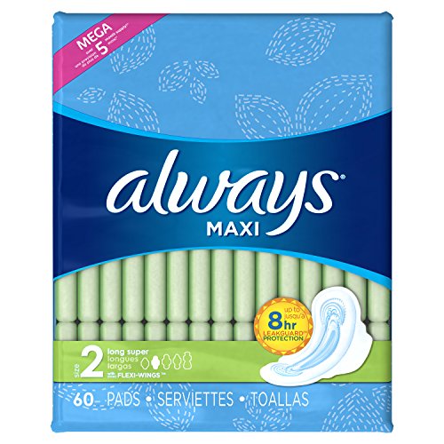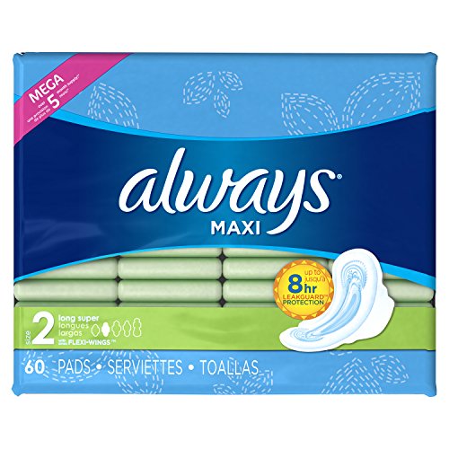 Always Maxi Size 2 Long Pads with Wings, Super Absorbency, Unscented, 60 Count,Packaging May Vary