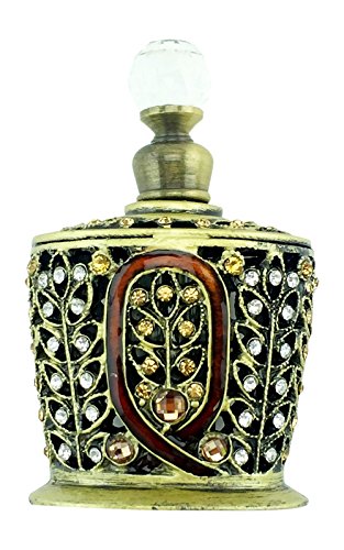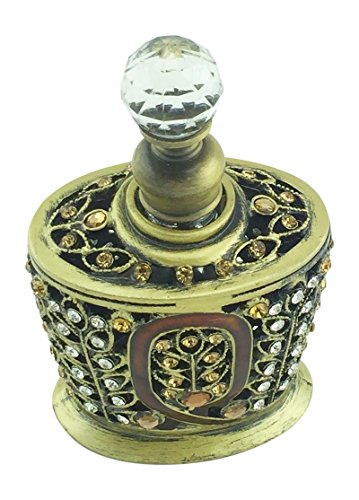 - Antique gold color pewter is accented with clear and amber crystals that encase the glass perfume bottle.