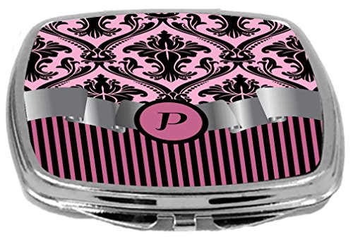 Rikki Knight Compact Mirror, Letter p Initial Light Pink Damask and Stripes