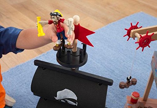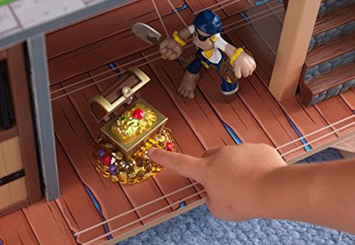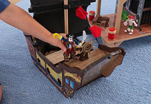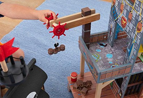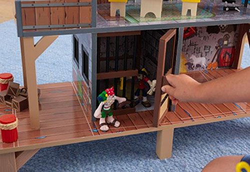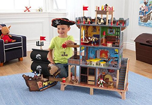 - Feature : Made up of 3 primary pieces - a pirate ship, a scout tower and a large pirate hideout. 2 cannons that light up and make sounds at the push of a button. / Treasure chest lights up at the push of a button. Moving crane lifts and lowers cargo. 4 molded pirates. / Long rope ladder and 5 furniture pieces. A jail cell for keeping prisoners from trying to escape. Large enough that multiple children can play at once.. / Made of composite wood products. Smart, sturdy construction. Packaged with detailed, step-by-step assembly instructions. / CARB P2, Solid wood. 18.5
