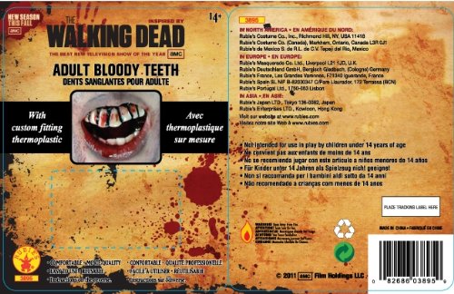 - Feature : Bloody teeth costume accessory inspired and officially licensed by the walking dead tv show / Includes custom fitting thermoplastic that makes these teeth easy and comfortable to wear / One size fits most adults / Look for all the walking dead costumes and accessories for your own look or to outfit an entire zombie crew / Rubies has all the licensed costume and acessory items you want for year around dress up fun