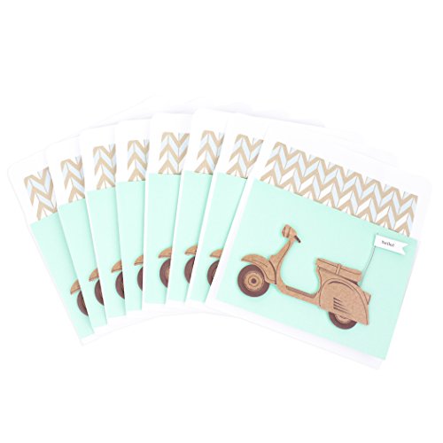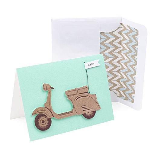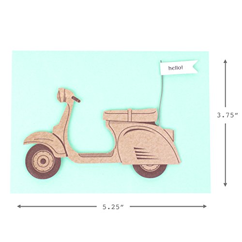 Studio : Hallmark Marketing Company, LLC (Office) Publisher : Hallmark Marketing Company, LLC (Office) Binding : Office Product Product Description These stylish notecards feature a scooter tip-on design, a die-cut flag with "Hello" lettering, and a designed envelope liner. The notecards are blank inside and measure 5.25 by 3.75 inches. Included are 8 cards and 8 envelopes; extra postage is required. Hallmark's Signature collection offers stylish shoppers a curated and considered line of upscale and unique cards and gift wrap that reflect their personal style. Hallmark was founded in 1910 when 18-year-old J.C. Hall arrived in Kansas City, Missouri, with a couple of shoeboxes of postcards under his arm and the American dream in his heart. Hallmark products are sold online and in nearly 40,000 retail stores across the globe and people continue to recognize the iconic Hallmark brand as "the very best." 0