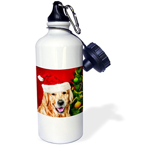 3dRose wb_223361_1 "Golden Retriever Dog in a Santa Hat with Christmas Tree Painting" Sports Water Bottle, 21 oz, White