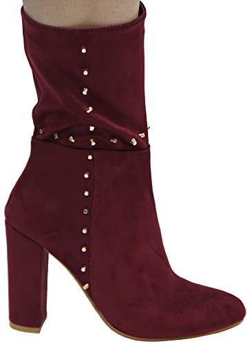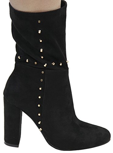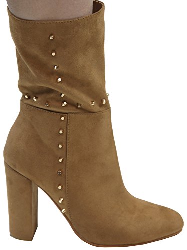 Product Description This mid-calf boot from Bella Marie features a closed, almond-shaped toe, wrapped block heel, and metallic gold tone studs. Imported. 0