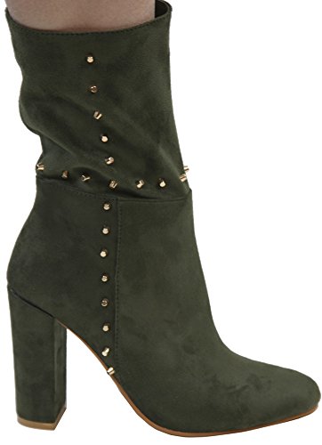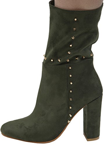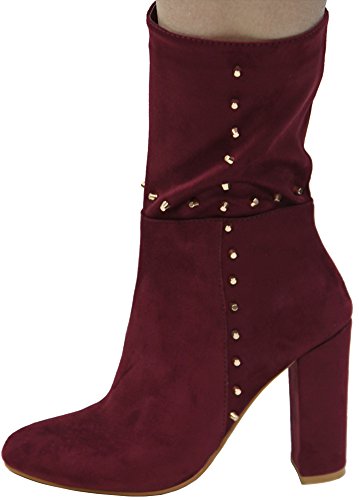 Bella Marie Women's Closed Almond Toe Studded Chunky Wrapped Heel Mid-Calf Boot