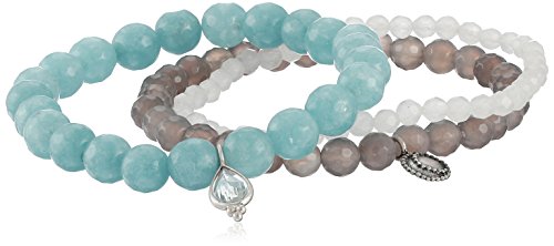 Inspire confidence in yourself and your style with the Satya Jewelry Sterling Silver Aquamarine, Angelite, and Agate Sacred Serenity Stretch Bracelet Set. Adorn your wrist with three bracelets featuring white jade, gray agate, and angelite beads with small aquamarine and sterling silver charms for stacked or individual wear. Crafted by hand in the USA, this set harmonizes a woman's style and spirituality with semi-precious stones and cherished symbols. Invite tranquility, courage and peace into your day with aquamarine, acceptance, truth, and compassion with angelite, and unity, protection, and understanding with white jade. Measuring 7 to 7-1/4 inches, this collection of bracelets stretch to fit over your wrist. Give this bracelet as a gift of confident speech and protection from anxiety to family and friends with the included Satya Jewelry gift pouch.Feature