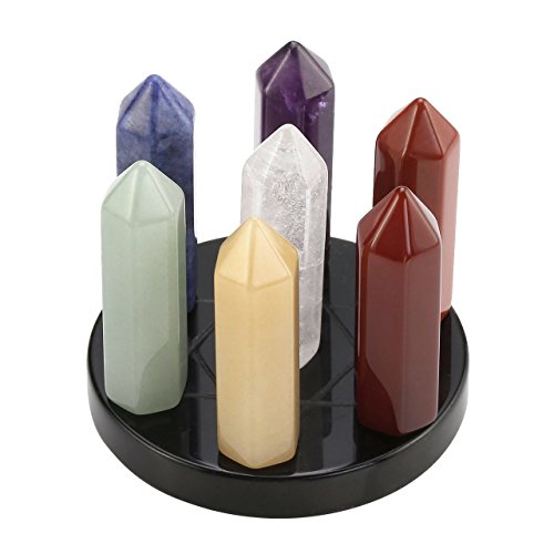 Top Plaza 7 Chakra Healing Crystals Wands Quartz Reiki Energy Tumbled Stones Set Hexagonal Points Array Statue Figurines W/Black Obsidian Stand 1.9×1.7 inches