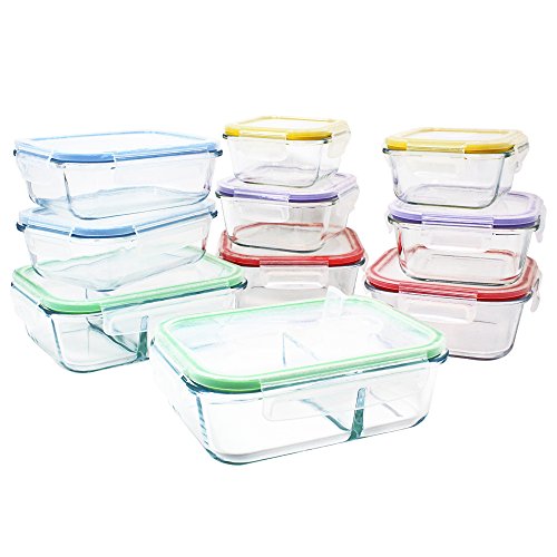 20 pieces set: include 10 borosilicate food storage containers in small, medium, and large sizes with 10 color matching lids.