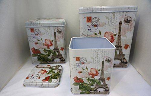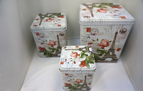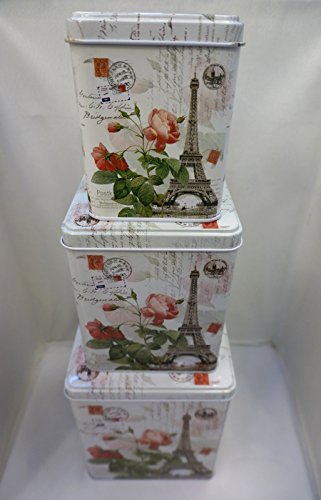 Vintage Eiffel Tower Pattern Storage Tins, Shabby Chic, Floral Roses Design Set of 3