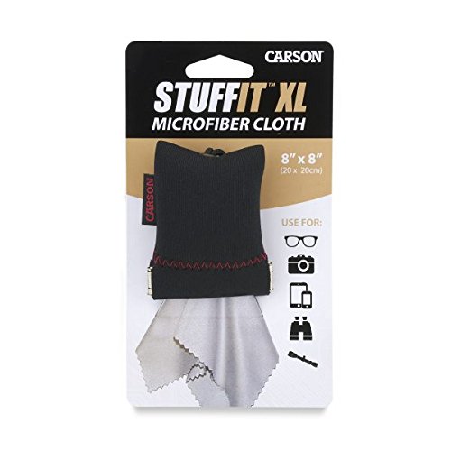 The Stuff-It XL from Carson is a microfiber lens cleaning system that features a super soft microfiber lens cloth that is housed inside of a protective pouch. Simply squeeze the sides of the protective pouch together and pull the 8.0 inch x 8.0 inch extra large cleaning cloth out to use. When not in use, pull the drawstring to retract the lens cloth back into the pouch and stuff the remaining cloth in with your fingers. The microfiber cloth is connected to the pouch so you won't have to worry about losing it. The protective pouch will keep the cloth clean, dry and protected. The Stuff-It XL is compact and extremely portable. The Stuff-It XL fits easily in your pocket, camera bag, binocular case or use the attached hook to clip it to your jacket or belt loop. The Stuff-It XL is ideal for cleaning eyewear, binocular lenses, scope lenses, camera lenses, GPS devices, smartphones, tablets and more. The Stuff-It XL microfiber lens cleaning system is a safe, easy and effective way to clean all types of lenses, screens and glass surfaces (Hand wash only). the Stuff-It XL will not scratch or damage surfaces in any way. The Stuff-It XL is backed by Carson one year limited warranty. This Carson product is warranted to be free from defects in material and workmanship for a period of one year from date of purchase. Please contact Carson for additional warranty details.Feature