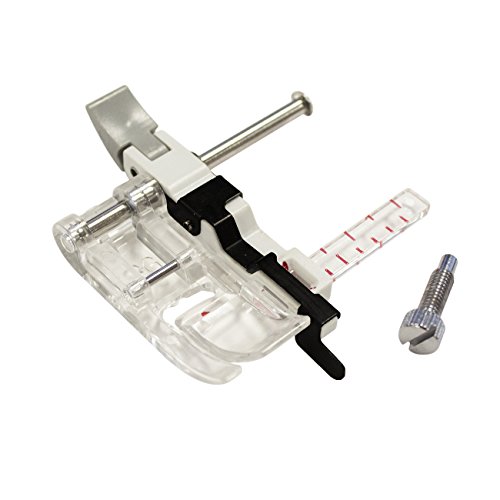 -. Binding : Office Product -. Brand : Janome -. Color : clear -. EAN : 0708038730431 -. Feature : Edge stitching could not get any easier with the sliding guide foot! You can adjust the flange to sit up to a full inch away from the edge of the foot in seconds and create perfectly straight hems every time. / he guide can be moved freely and easily by just lifting the lever in the back of the foot, instead of having to mess with an annoying screw. / The clear markings make certain you know exactly where you want your foot to go. -. Label : Janome -. Manufacturer : Janome -. MPN : 4614195 -. PackageQuantity : 1 -. PartNumber : 4614195 -. ProductGroup : Art and Craft Supply -. ProductTypeName : ART_SUPPLIES -. Publisher : Janome -. Studio : Janome -. Title : Janome Sliding Guide Foot for 7mm Machines -. UPC : 708038730431