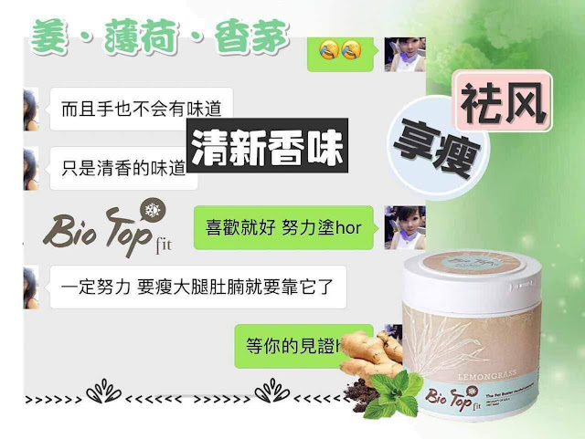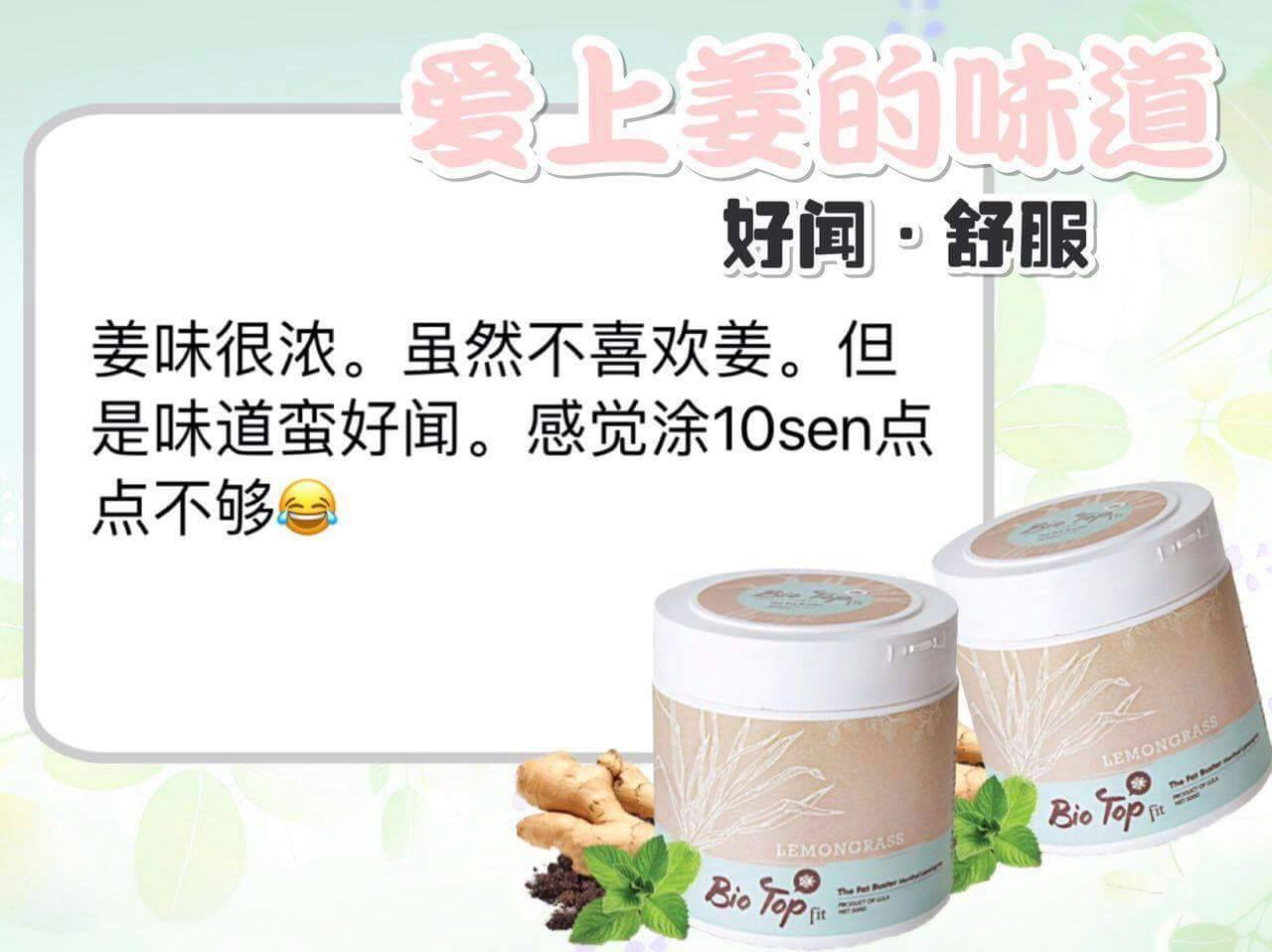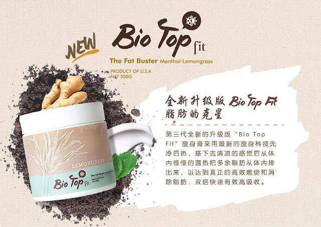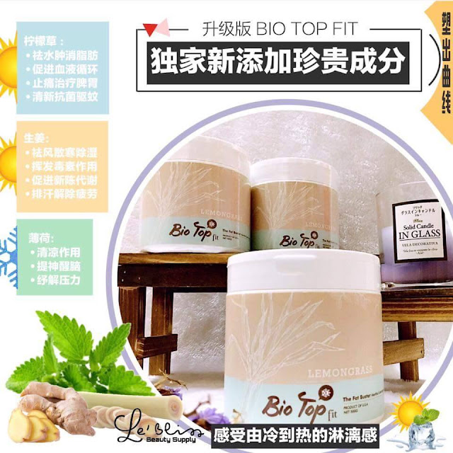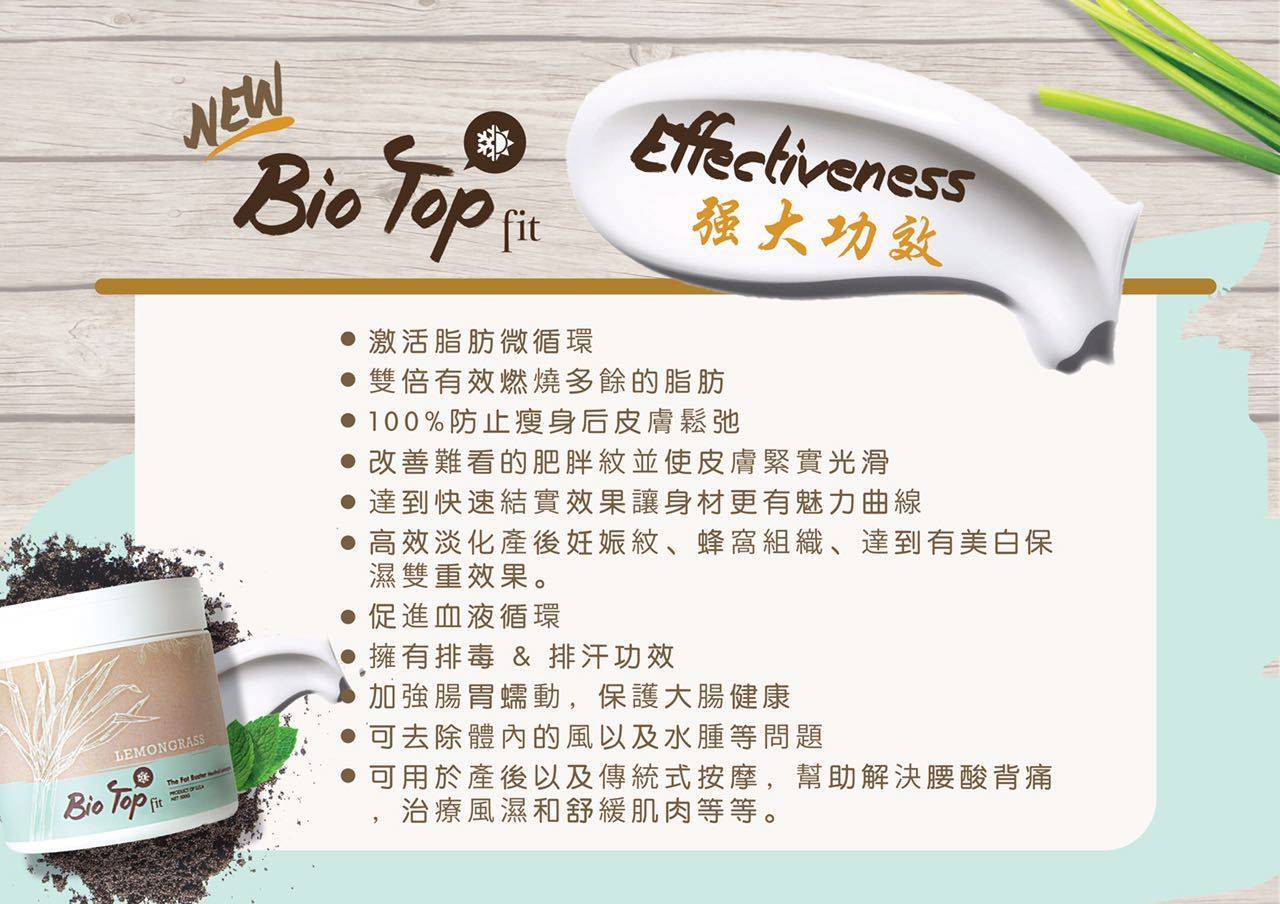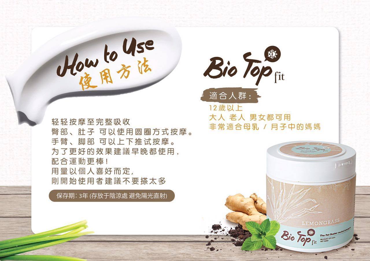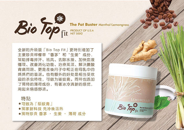 這次全新的升級版『Bio Top Fit』更特別增加了主要珍貴檸檬草"香茅”和"生姜”成份,幫助排毒排汗、祛风、去除水腫、加快血液循環、改善消化功能、治療風濕、解決腰酸背痛問題、更是產後月子中和正在母乳中的媽媽們的首選。也有额外的好处是相当受欢迎的杀虫特性,可做为驱蚊膏。同時也添加了獨特的薄荷成份,有著冰冷清新的感觉,用起來倍感舒適。