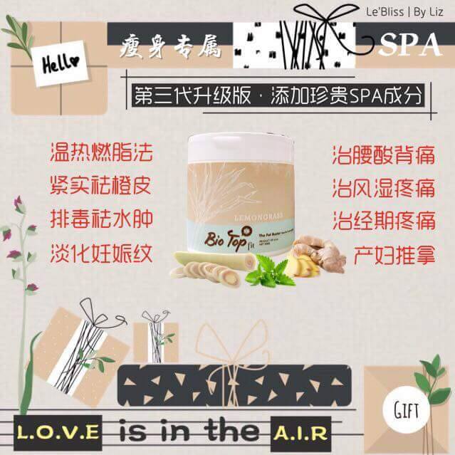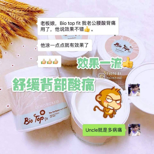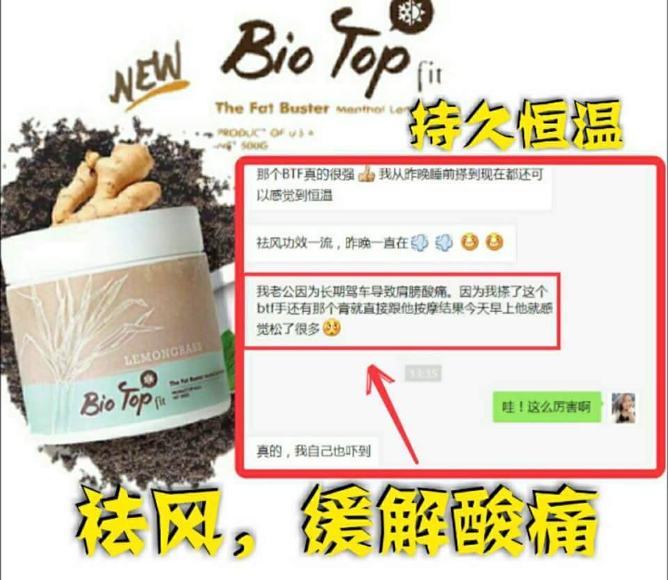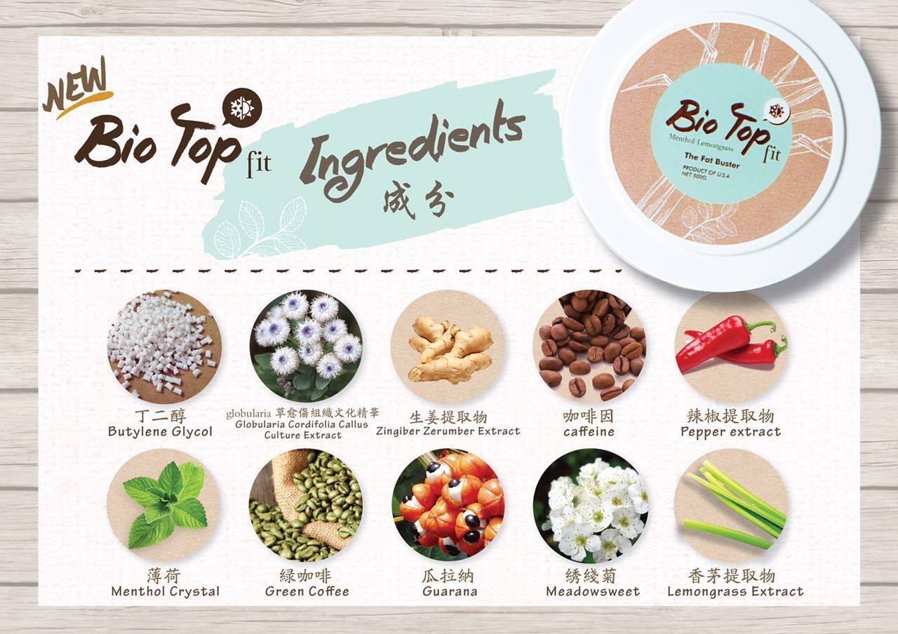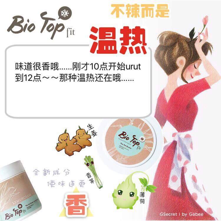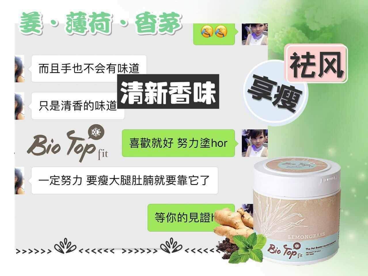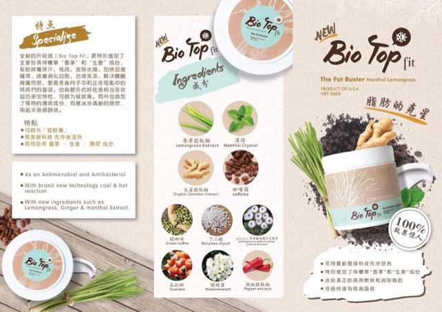 這次全新的升級版『Bio Top Fit』更特別增加了主要珍貴檸檬草"香茅”和"生姜”成份,幫助排毒排汗、祛风、去除水腫、加快血液循環、改善消化功能、治療風濕、解決腰酸背痛問題、更是產後月子中和正在母乳中的媽媽們的首選。也有额外的好处是相当受欢迎的杀虫特性,可做为驱蚊膏。同時也添加了獨特的薄荷成份,有著冰冷清新的感觉,用起來倍感舒適。