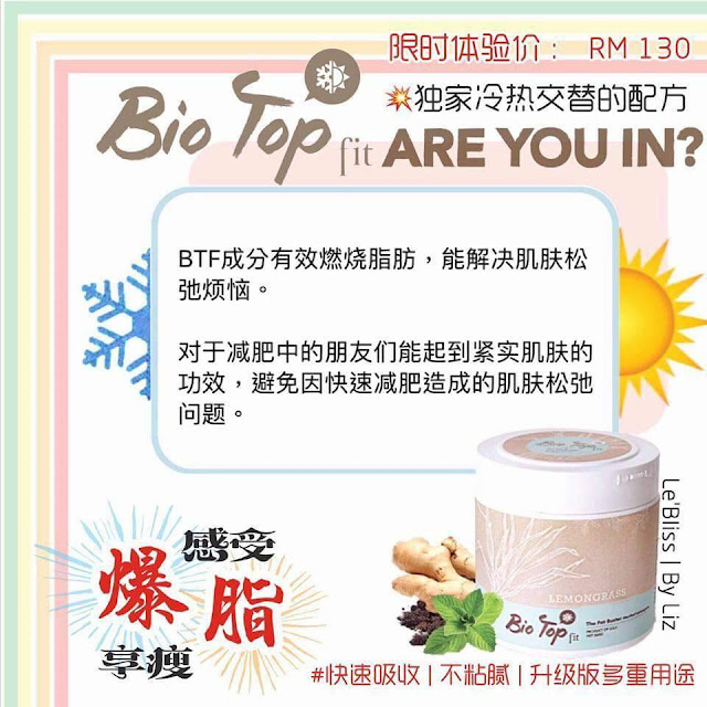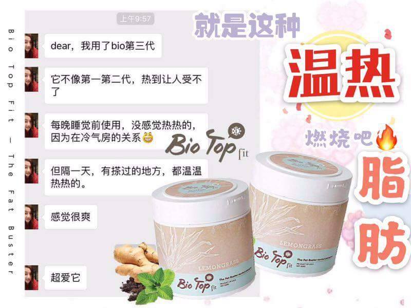 第三代全新的升級版『Bio Top Fit』瘦身膏採用最新的瘦身科技先冷后热,搽下去清涼的感覺後從體內慢慢的溫熱把多餘脂肪從體內排出來,以達到真正的高效燃烧和消除脂肪,雙倍快速有效高吸收。它能夠改善肥胖紋並使皮肤更紧实,光滑。有助于紧实腹部的肌肉而讓身材更有曲線,並有效淡化妊娠紋、蜂窩組織、達到美白保濕的雙重效果。